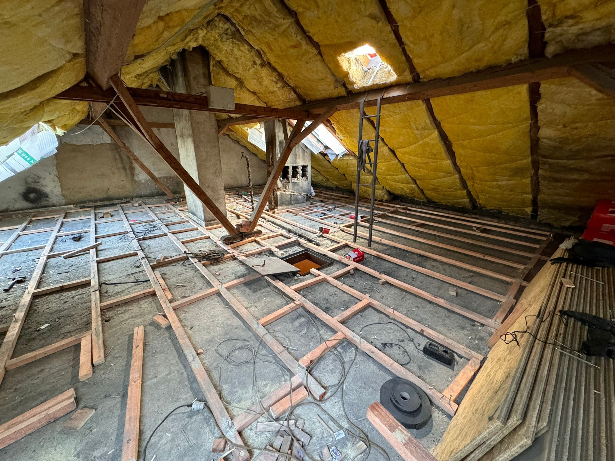 - Etapa I: odstrojení střešní krytiny, ošetření krovů, parofolie, nové laťování, čištění střešní krytiny od mechu a náletů, pokrytí, izolace, rekonstrukce podkroví na obyvatelné části, na klíč.